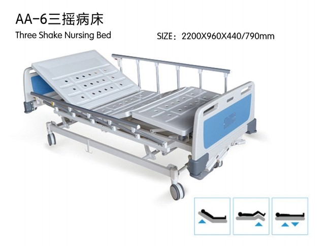 三搖床的功能更復(fù)雜一些。它除了有腿板和背板的升降功能外,床板也可以有升降功能。經(jīng)過搖把的搖動,床板能夠升降50至70公分。三搖床在臨床應(yīng)用中一般用于重病患者。